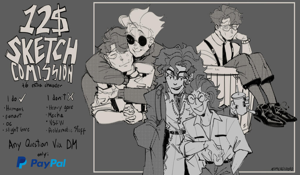 You can use the drawing as a profile picture, an OC reference, or anything else with non-profit purposes.You do not have permission to remove or hide my signature from the drawing.I have the right to reject the commission.